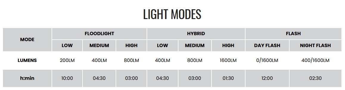 HYBRID: Low 400 lumenów/4:30h, Medium 800 lumenów/3:00h, High 1600 lumenów/1:30h