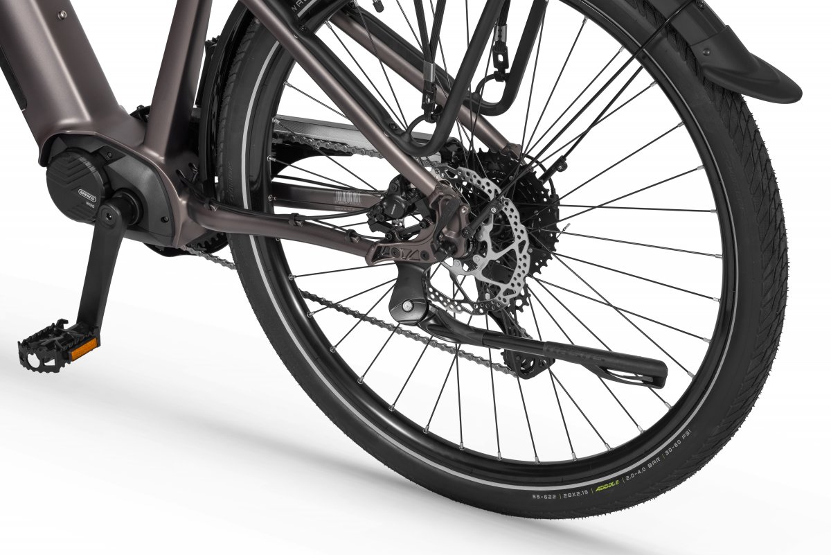 Nowa generacja MX 300 została dopracowana pod względem ergonomii i estetyki. Zintegrowany wyświetlacz Bafang w mostku tworzy czysty kokpit z ukrytym prowadzeniem przewodów, a aplikacja Bafang Go pozwala rozszerzyć funkcjonalność systemu e-bike. Wzmocniona aluminiowa rama, duże koła 28 cali z szerokimi oponami Schwalbe oraz amortyzowany widelec o skoku 100 mm zapewniają komfort i stabilność jazdy nawet na dłuższych trasach.