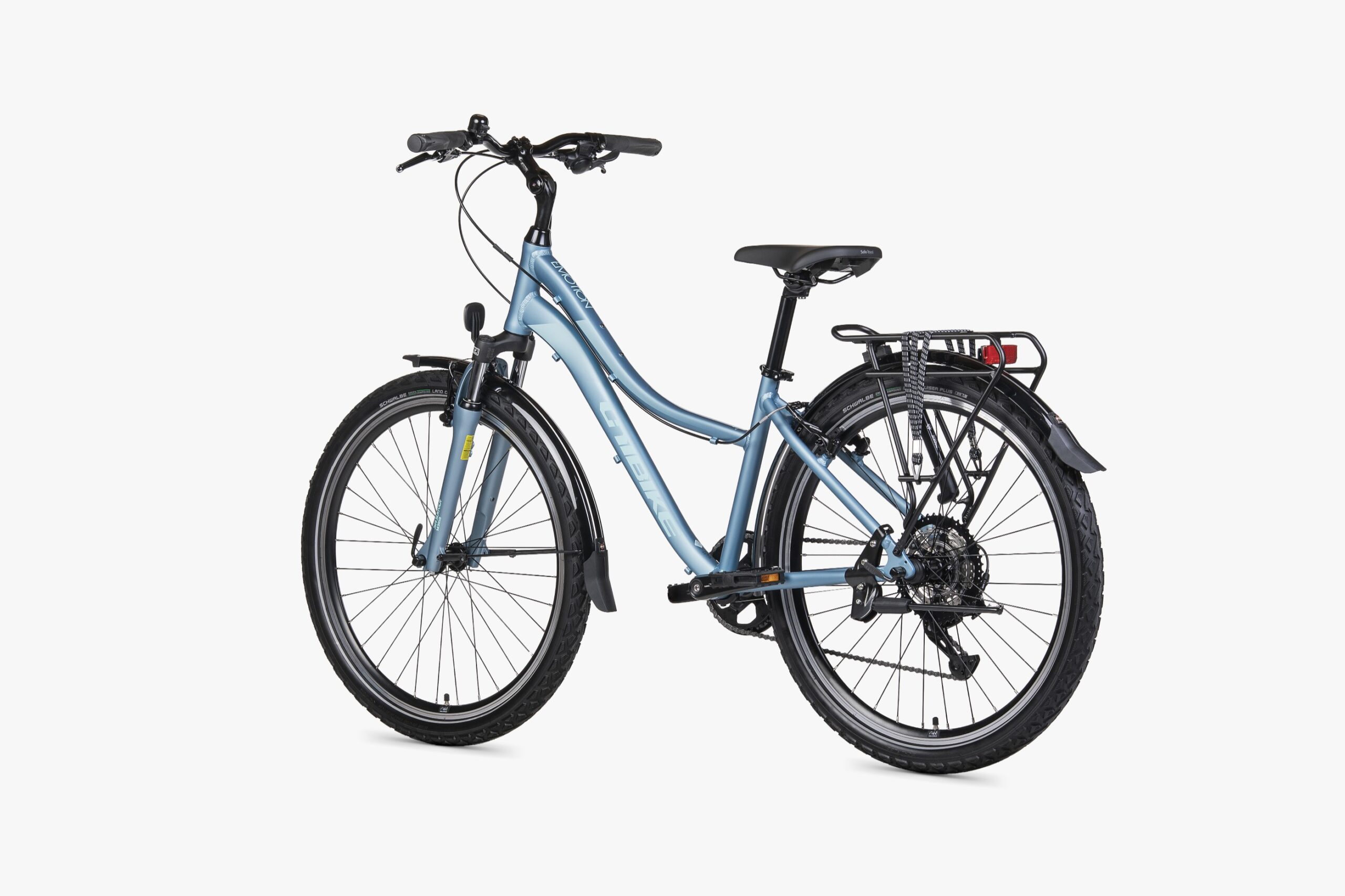 Model został wyposażony w praktyczne dodatki takie jak błotniki SKS, aluminiowy bagażnik przystosowany do sakw, podpórkę oraz dzwonek i pompkę, dzięki czemu rower jest gotowy do codziennego użytkowania.