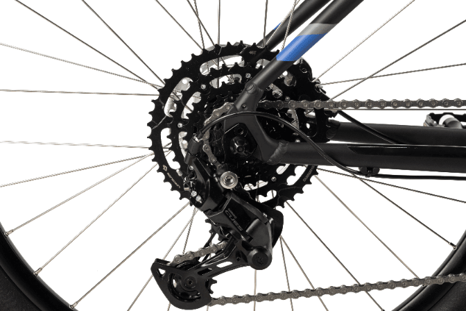 Rama wykonana z aluminium 6061-T6 zapewnia sztywność i odporność na uszkodzenia, a amortyzowany widelec SR Suntour XCT30 ze skokiem 100 mm i blokadą hydrauliczną pozwala dostosować pracę zawieszenia do warunków na trasie. Napęd oparty na grupie Shimano CUES U4000 z kasetą 11–46T gwarantuje płynną zmianę biegów i duży zakres przełożeń, idealny do podjazdów i zjazdów. Hydrauliczne hamulce Shimano MT200 oferują mocne i pewne hamowanie w każdych warunkach.