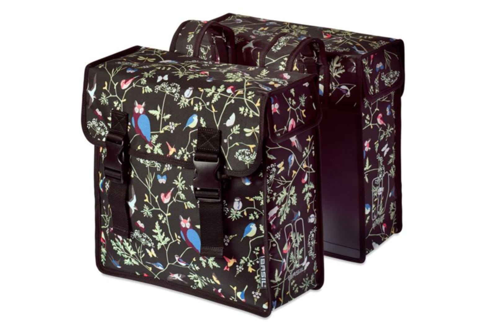 Sakwa miejska podwójna BASIL WANDERLUST DOUBLE BAG 35L, mocowanie na paski, wodoodporny poliester, czarna. Podwójna sakwa Basil Wanderlust w klasycznej czerni z imponującym nadrukiem ptaka. Idealna do dodania osobowości do roweru przy jednoczesnym maksymalizowaniu przestrzeni do przechowywania. Nigdy nie zabraknie Ci miejsca, w którym możesz schować swoje cenne akcesoria dzięki 35 litrowej pojemności.